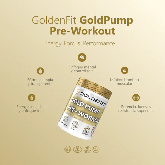 GoldenFit GOLDPUMP 300g es un pre entrenamiento profesional diseñado para deportistas que buscan más energía, mayor enfoque y un rendimiento físico superior. Su fórmula avanzada combina ingredientes de suplementación deportiva de máxima pureza como Beta-Alanina, Creatina Monohidrato, A-AKG, L-Citrulina y Cafeína Anhidra, junto con neurosoportes naturales como GABA, Colina y L-Tirosina. El resultado: más energía sostenida, mejor concentración mental y un bombeo muscular intenso durante cada sesión. Un pre entreno natural y transparente, sin mezclas ocultas, creado para quienes entrenan sin límites.
